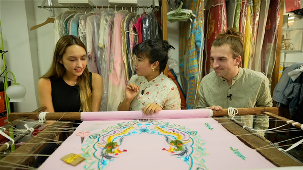 “老板,我是來做戲服模特”“我來考察非遺文化項(xiàng)目”美國的潘明花和意大利徐天佑一起來到狀元坊戲服工廠,戲服刺繡傳承人何鳳婷熱情地講述著戲服刺繡的歷史、制作工序、角色樣式,也讓他們親自體驗(yàn)了刺繡。潘明花驚嘆于刺繡工藝遠(yuǎn)比想象中要復(fù)雜得多。他們穿著戲服走近粵劇博物館,深入了解以粵劇為代表的嶺南文化。徐天佑表示戲服刺繡非遺的傳承不僅是技術(shù)工藝的傳承,同時(shí)也是文化的傳承。何鳳婷說如何讓更多年輕人喜愛和關(guān)注這項(xiàng)手藝,如何能繼續(xù)傳承下去是目前亟待解決的問題。為了讓刺繡與現(xiàn)代審美相結(jié)合,老板將刺繡工藝與年輕人喜愛的IP玩偶組合,將“激活非遺+創(chuàng)新思路+文化傳承”理念融入到刺繡中,讓這門手藝更面向大眾,推動(dòng)非遺的創(chuàng)造性轉(zhuǎn)化,提高與現(xiàn)代生活的緊密度,成為融入現(xiàn)代生活中的潮流元素,讓非遺重?zé)ü獠省?/p>