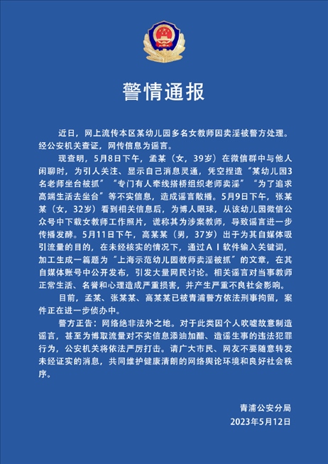 ·上海青浦警方:網傳幼兒園多名女教師賣淫被處理系謠言,刑拘3人。