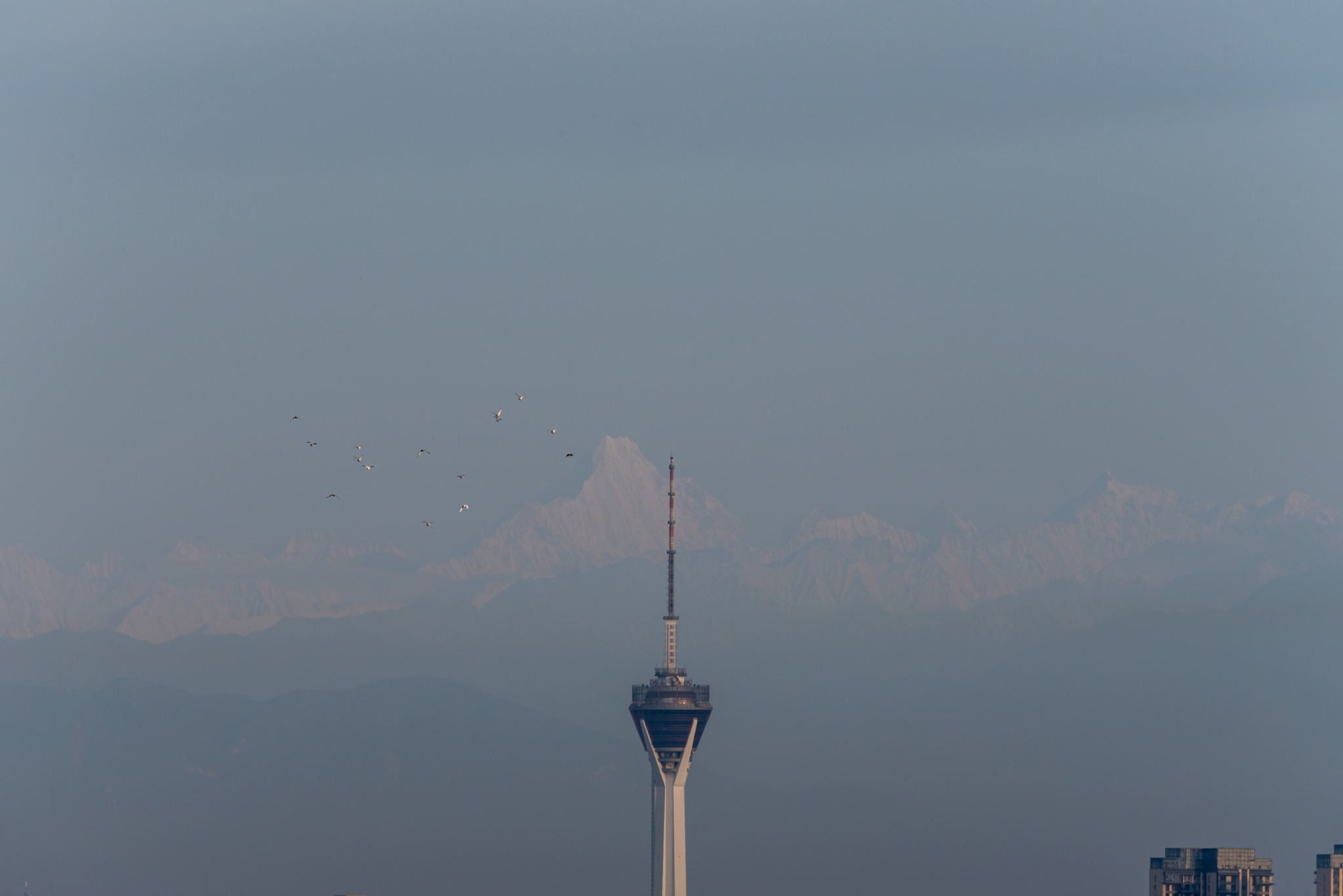 2023年5月13日,成都,幺妹峰露出真容,與城市建筑同框。視覺中國