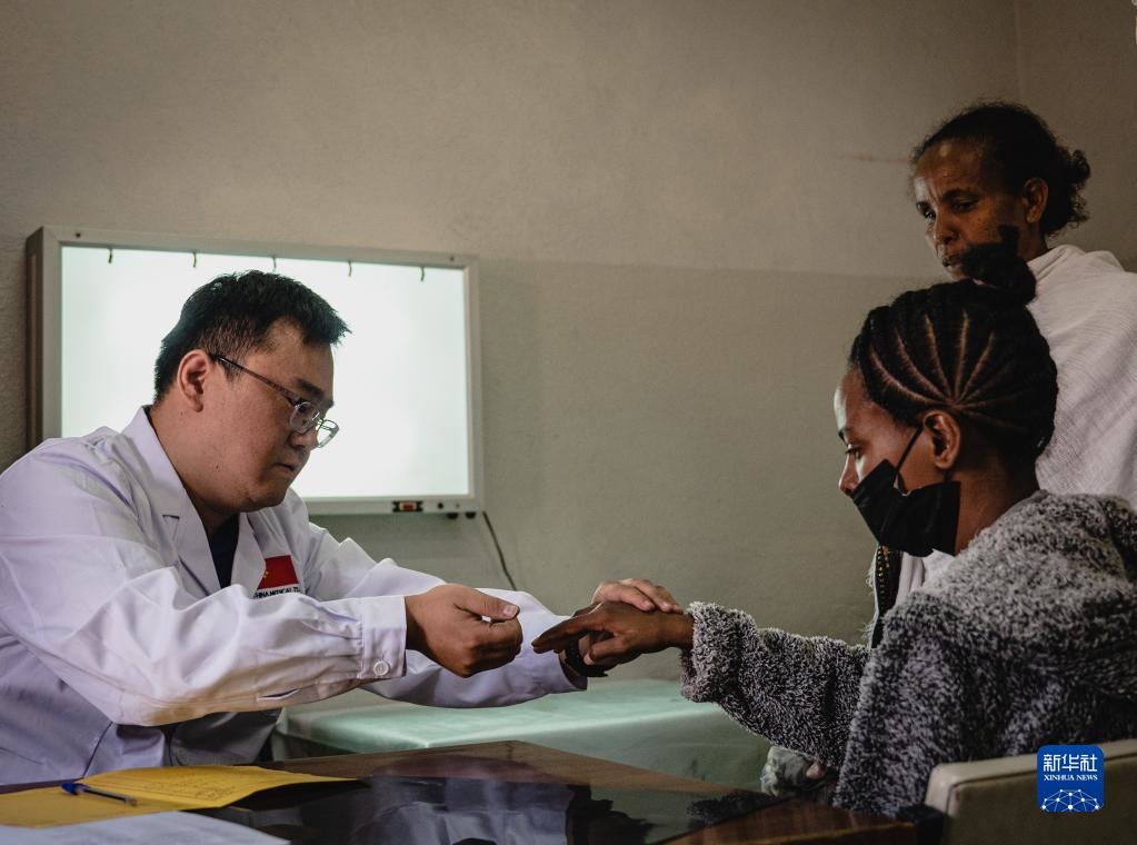 5月9日,在厄立特里亞首都阿斯馬拉的哈利貝特醫(yī)院,醫(yī)療隊脊柱外科醫(yī)生周大凱(中)為患者做檢查。