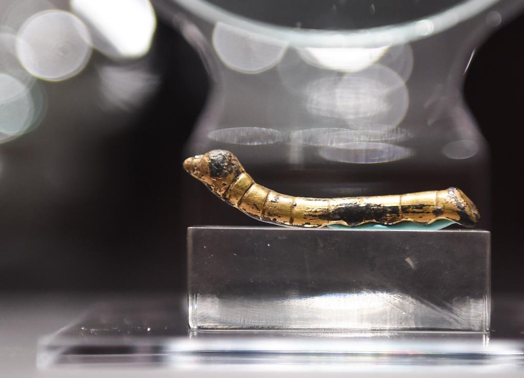 這條“鎏金銅蠶”1984年出土于陜西石泉縣,首尾共計(jì)9個(gè)腹節(jié),制作精致,造型逼真。新華社記者 羅曉光 攝
