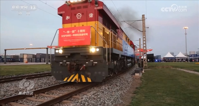 就在上個月,為紀念“一帶一路”十周年特別開行的中歐班列——“一帶一路”十周年長安號西安—中亞專列從西安國際港務區(qū)發(fā)車。2013年11月,首列中歐班列長安號正是由這里出發(fā),開往哈薩克斯坦。從這里啟程的長安號,從最初的年開行46列發(fā)展到去年的4600多列,十年增長了100倍。十年來,長安號累計開行超過1.6萬列。其中,中亞五國開行量達到4250列,為促進中國同中亞互聯(lián)互通與經(jīng)貿(mào)合作發(fā)揮了重要作用。