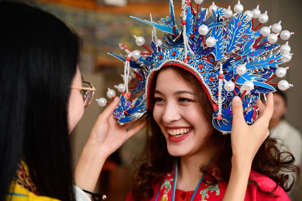在青島的中國(guó)石油大學(xué)(華東)大學(xué)生活動(dòng)中心,哈薩克斯坦留學(xué)生珍珠體驗(yàn)京劇文化(2018年5月3日攝)