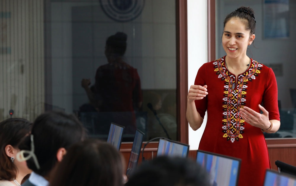 土庫(kù)曼斯坦外教加漢在蘭州交通大學(xué)國(guó)際教育學(xué)院國(guó)際中文實(shí)踐基地給留學(xué)生上課(2023年5月5日攝)。在中國(guó)學(xué)習(xí)工作長(zhǎng)達(dá)十多年,如今加漢能說(shuō)一口流利的漢語(yǔ)。