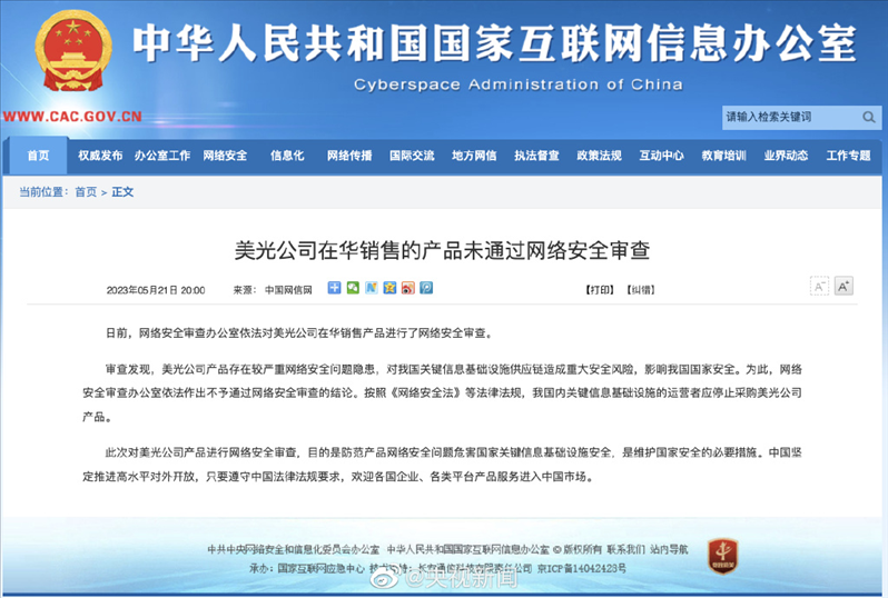 ·影響我國國家安全,美光公司在華銷售的產(chǎn)品未通過網(wǎng)絡安全審查。按照《網(wǎng)絡安全法》等法律法規(guī),我國內(nèi)關(guān)鍵信息基礎設施的運營者應停止采購美光公司產(chǎn)品。
