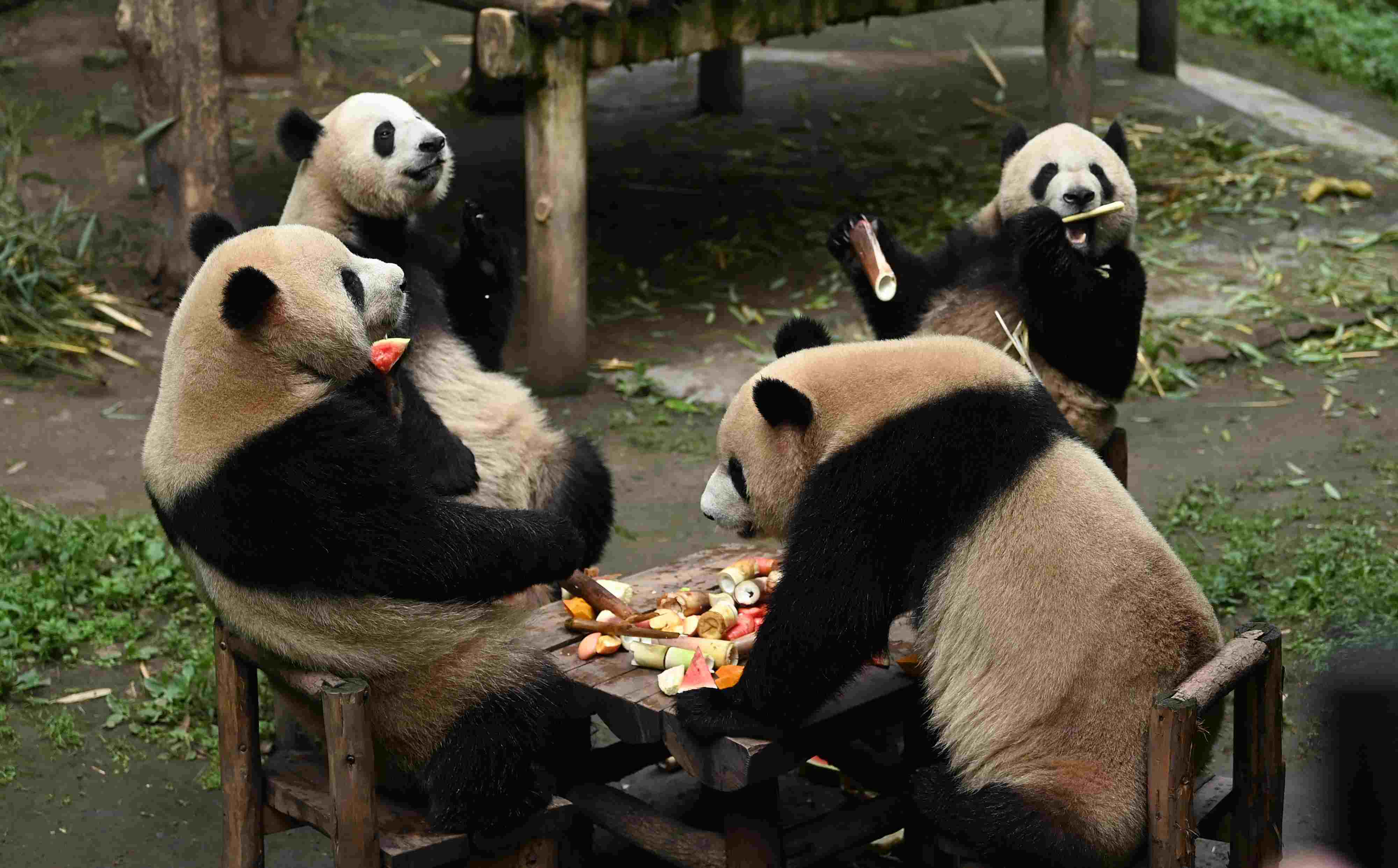 2023年5月21日,在重慶動物園內(nèi),大熊貓圍桌而坐,享用美食,萌態(tài)十足。 視覺中國