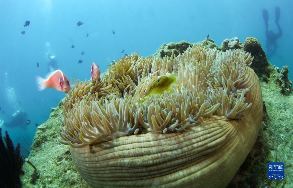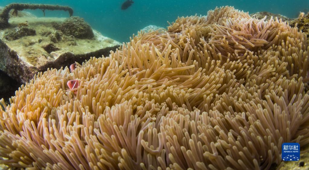 這是在蜈支洲島海域海洋牧場(chǎng)拍攝的小丑魚和???月18日攝)。