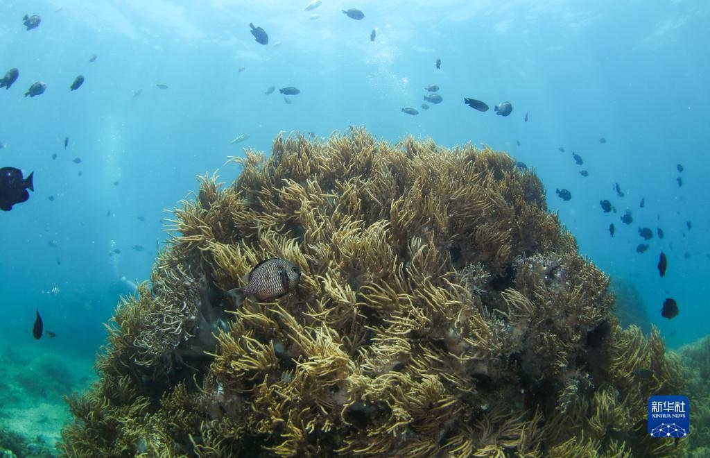 這是在蜈支洲島海域海洋牧場(chǎng)拍攝的珊瑚和魚群(2021年5月21日攝)。