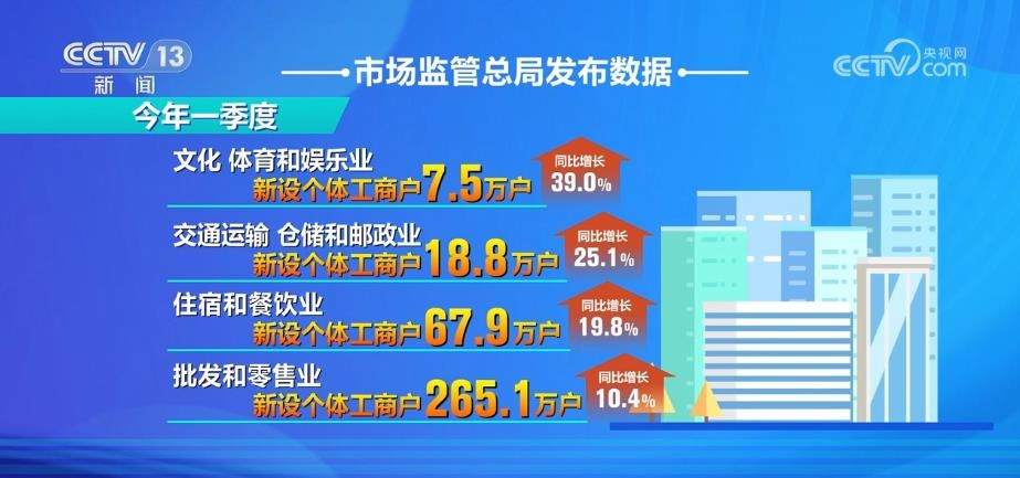 市場監(jiān)管總局發(fā)布數(shù)據(jù)顯示,今年一季度,文化、體育和娛樂業(yè),交通運(yùn)輸、倉儲(chǔ)和郵政業(yè),住宿和餐飲業(yè),批發(fā)和零售業(yè)等行業(yè)新設(shè)個(gè)體工商戶分別為7.5萬戶、18.8萬戶、67.9萬戶、265.1萬戶,同比分別增長39.0%、25.1%、19.8%、10.4%。