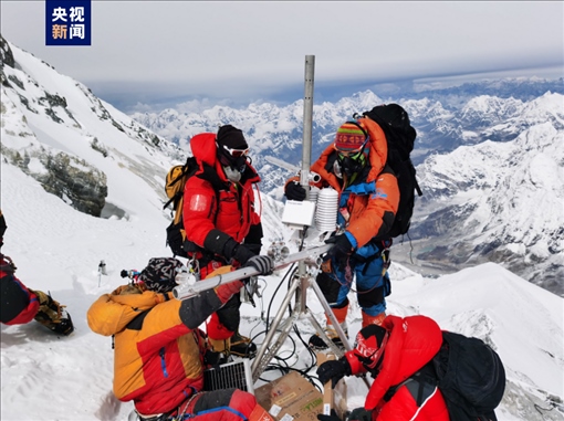 5月23日上午,2023“巔峰使命”珠峰科考登山隊(duì)員正在海拔8830米世界海拔最高的自動氣象站做技術(shù)升級。
