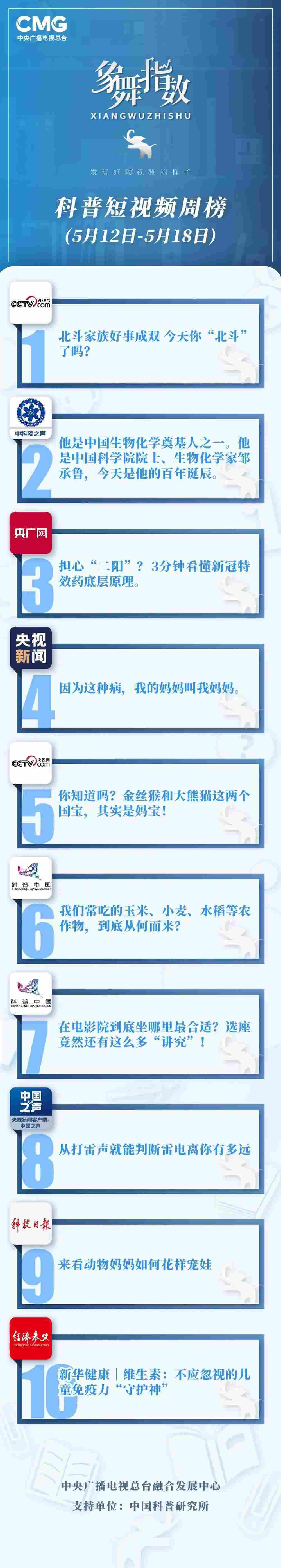 中央廣播電視總臺“象舞指數(shù)”評議品牌,推出科普短視頻周榜、總臺科普短視頻周榜。在2023年5月12日-5月18日,值得注目的內(nèi)容有: