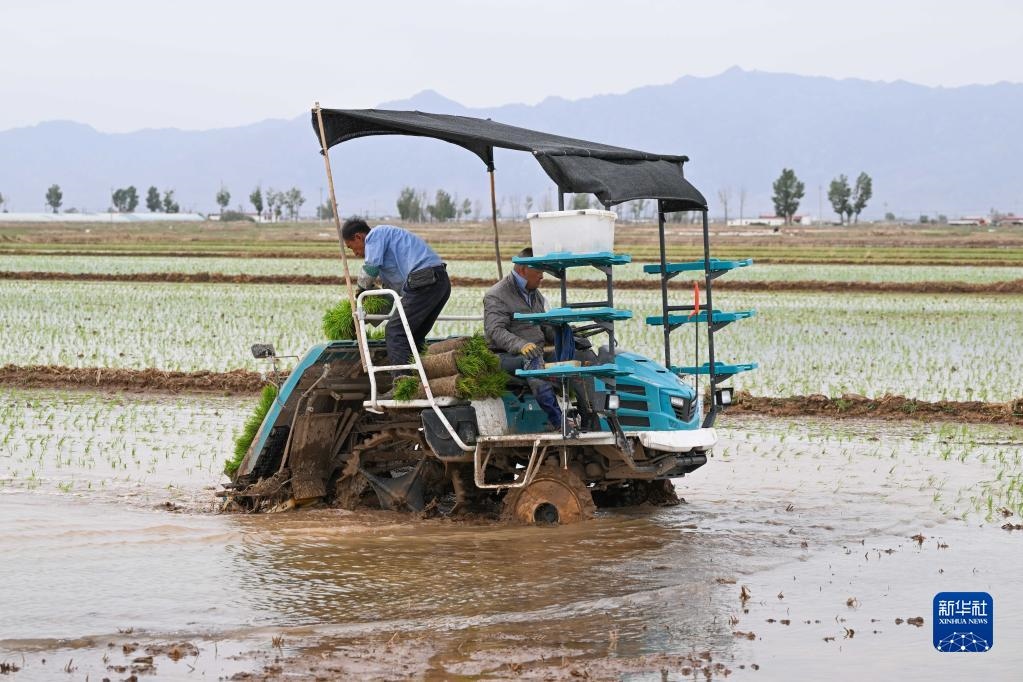 5月23日,達(dá)拉特旗昭君鎮(zhèn)村民在鹽堿地改良水稻田中使用農(nóng)機插秧。