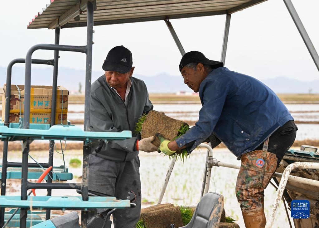5月23日,達(dá)拉特旗昭君鎮(zhèn)村民在為農(nóng)機添加秧苗。