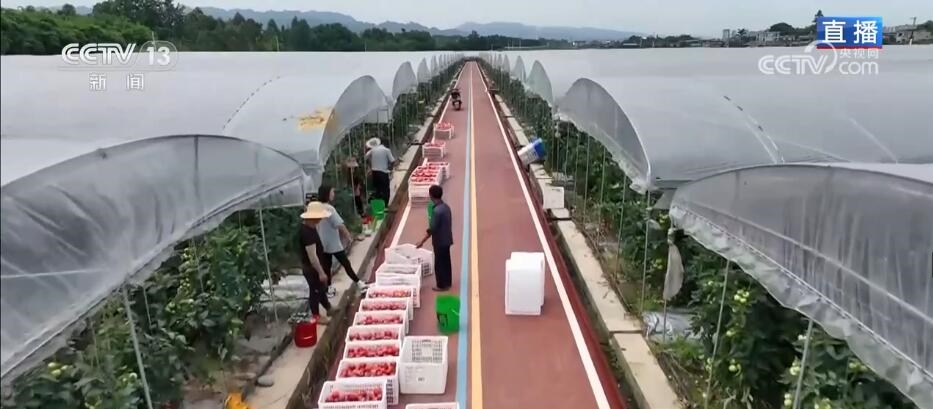 總臺(tái)記者 蔣林:歡迎各位繼續(xù)跟隨著我們?cè)谒拇纯础叭摹睍r(shí)節(jié)的農(nóng)忙景象。此刻我從平原地區(qū)的水稻高標(biāo)準(zhǔn)農(nóng)田來到了金銀河村的蔬菜種植產(chǎn)業(yè)園。通過空中航拍的畫面大家可以看到,金銀河村緊臨著長江的三級(jí)支流青衣江,歷史上的金銀河村就是來自青衣江的沖刷和堆積,村里的土地含沙量高,土壤保水能力不夠,不適合栽種像水稻這樣的需要農(nóng)田蓄水、保水的作物。當(dāng)然,這樣的土地對(duì)于很多蔬菜品種來說,卻是絕佳好地,當(dāng)?shù)匾虻刂埔烁闫鹆怂竞褪卟斯灿械默F(xiàn)代產(chǎn)業(yè)園區(qū)。在這個(gè)園區(qū),適合蔬菜種植的面積達(dá)到7萬畝,平均一年能種三季蔬菜,大大提升了土地產(chǎn)出與利用效果,也保證了每一個(gè)人的“菜籃子”。眼下,今年春天播種的番茄、黃瓜、茄子、豇豆等眾多時(shí)令蔬菜陸續(xù)成熟,新鮮上市,讓我們感受到初夏時(shí)節(jié)的豐收景象。