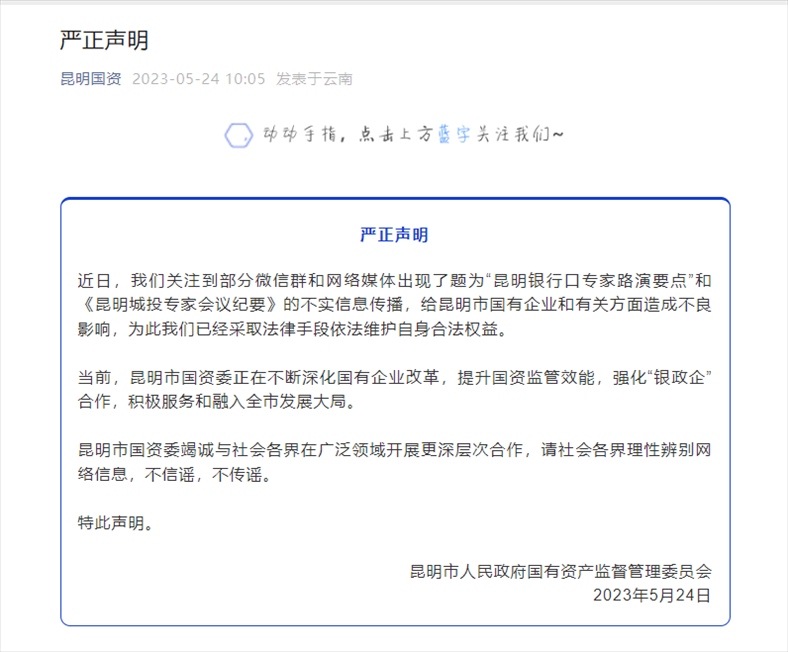 ·昆明市國資委發(fā)布聲明,“昆明銀行口專家路演要點”和《昆明城投專家會議紀要》不實。