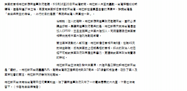 這兩天,譚主發(fā)現(xiàn)臺灣中時新聞網(wǎng)刊發(fā)了一篇快評文章:《特拉斯悄悄走了》。文章說到:特拉斯來臺沒有給臺灣帶來任何實質(zhì)利益,除了讓民進黨當局又做了一次毫無意義的大內(nèi)宣,什么也沒有留下。
