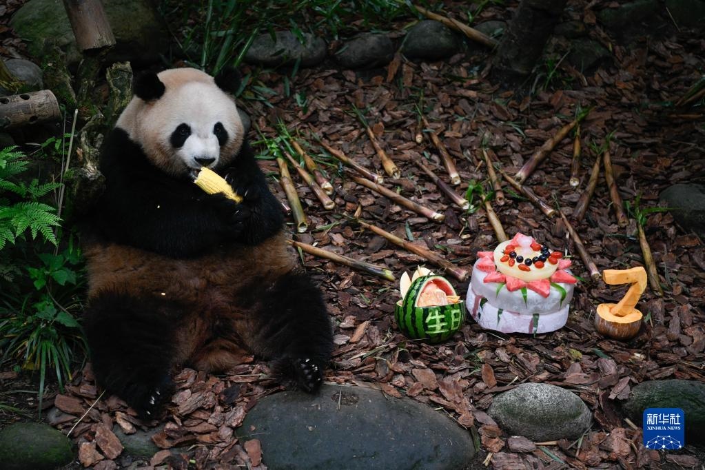 5月29日,在成都大熊貓繁育研究基地都江堰野放繁育研究中心,梅蘭在吃竹筍。當日是大熊貓梅蘭的7歲生日,成都大熊貓繁育研究基地都江堰野放繁育研究中心為它準備了生日大餐。
