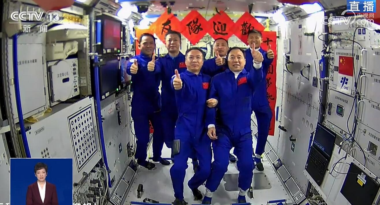 央視網(wǎng)消息:宇宙星河浪漫,探索永不止步。今天(5月30日)9時(shí)31分,搭載神舟十六號(hào)載人飛船的長(zhǎng)征二號(hào)F遙十六運(yùn)載火箭在酒泉衛(wèi)星發(fā)射中心點(diǎn)火發(fā)射,發(fā)射任務(wù)取得圓滿成功。神舟十六號(hào)航天員景海鵬、朱楊柱、桂海潮順利進(jìn)入太空。神舟十六號(hào)載人飛船入軌后,在16時(shí)29分成功對(duì)接于空間站天和核心艙徑向端口。之后,神舟十六號(hào)航天員乘組從飛船返回艙進(jìn)入軌道艙。翹盼已久的神舟十五號(hào)航天員乘組打開“家門”,歡迎遠(yuǎn)道而來(lái)的神舟十六號(hào)航天員乘組入駐“天宮”。