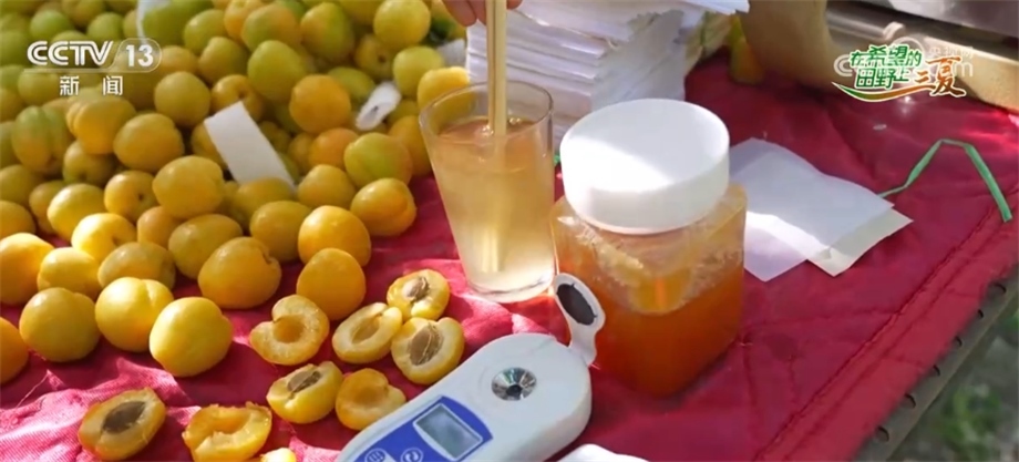其實(shí)輪臺(tái)白杏在新疆本地也是非常有口碑的。大家知道嗎?輪臺(tái)白杏在當(dāng)?shù)匾脖环Q作是“白色蜂蜜”,那它到底擔(dān)不擔(dān)得起這個(gè)稱號(hào)?我們今天在現(xiàn)場(chǎng)給大家?guī)砹艘粋€(gè)小的試驗(yàn),這是一杯白水加了三勺蜂蜜,可以看到它已經(jīng)是蜂蜜水的顏色了,我們通過測(cè)糖儀來測(cè)一下蜂蜜水的糖度,17度。那我們來測(cè)一下我們剛才嘗的這個(gè)輪臺(tái)白杏,擠一些它的汁液出來,16度,已經(jīng)非常接近蜂蜜水的甜度了。