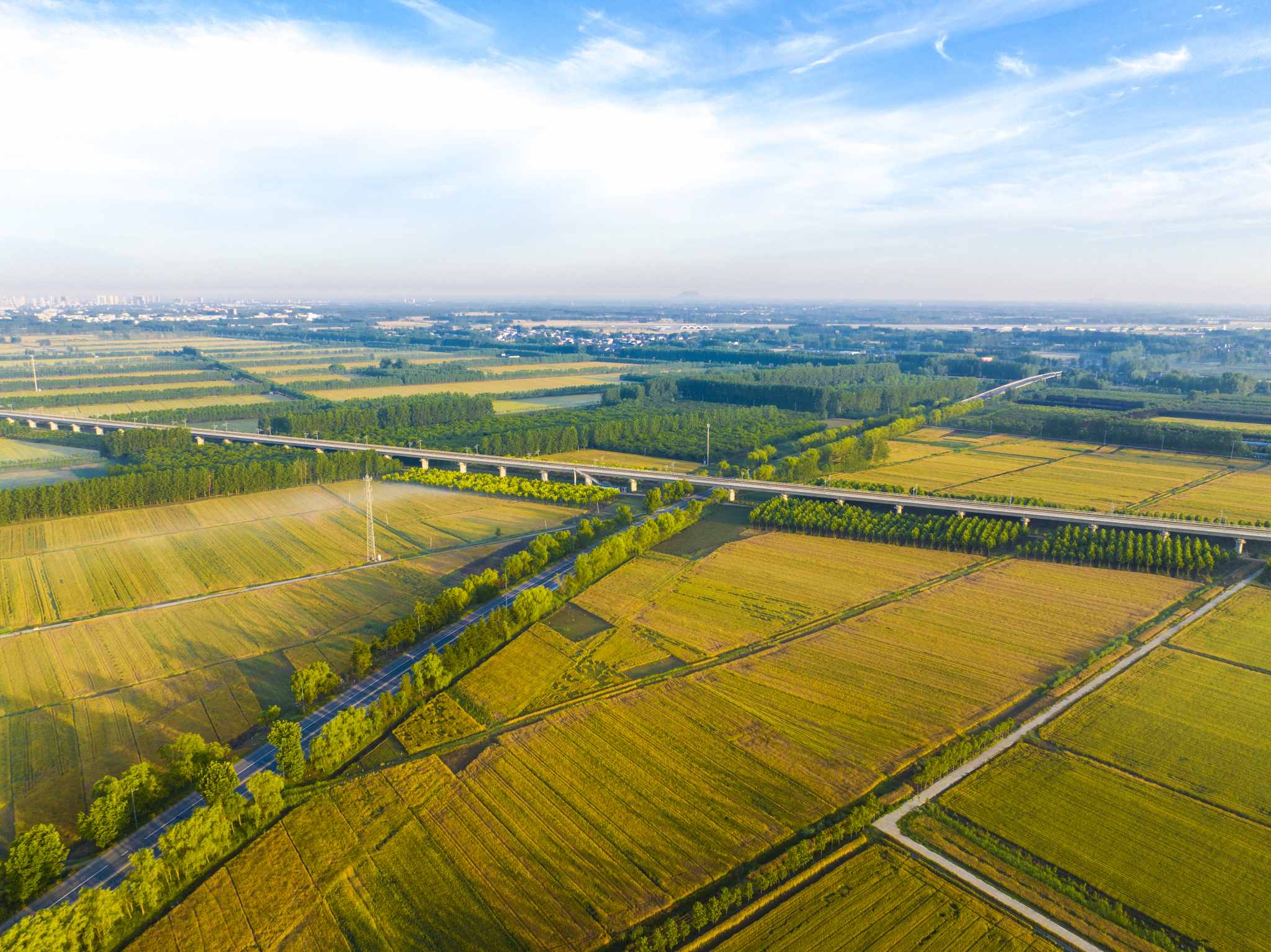 2023年6月3日,江蘇連云港,東海縣,金色田野與村莊、道路、河流共同構(gòu)成了一幅秀美的夏日豐收畫卷。視覺中國(guó)
