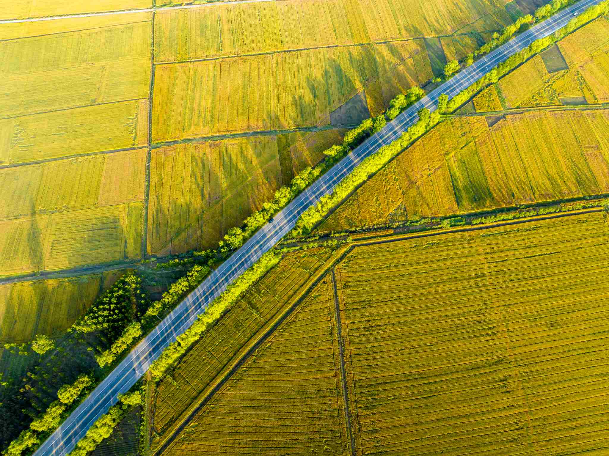 2023年6月3日,江蘇連云港,東??h,金色田野與村莊、道路、河流共同構(gòu)成了一幅秀美的夏日豐收畫卷。視覺中國(guó)
