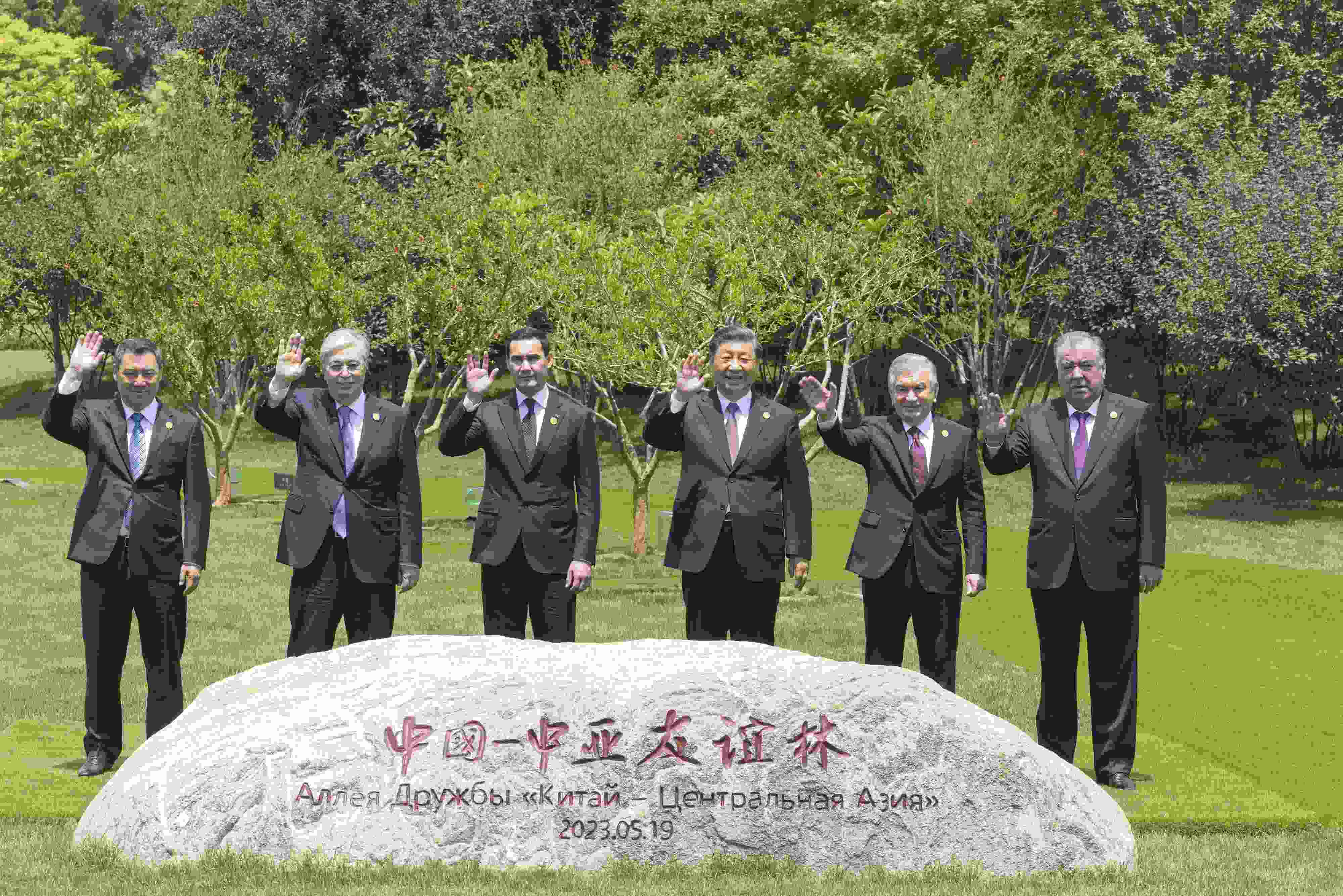 △5月19日上午,習(xí)近平主席在陜西省西安市主持首屆中國(guó)-中亞峰會(huì)并發(fā)表主旨講話。峰會(huì)結(jié)束后,習(xí)近平和中亞五國(guó)元首共同種下六棵石榴樹(shù)。
