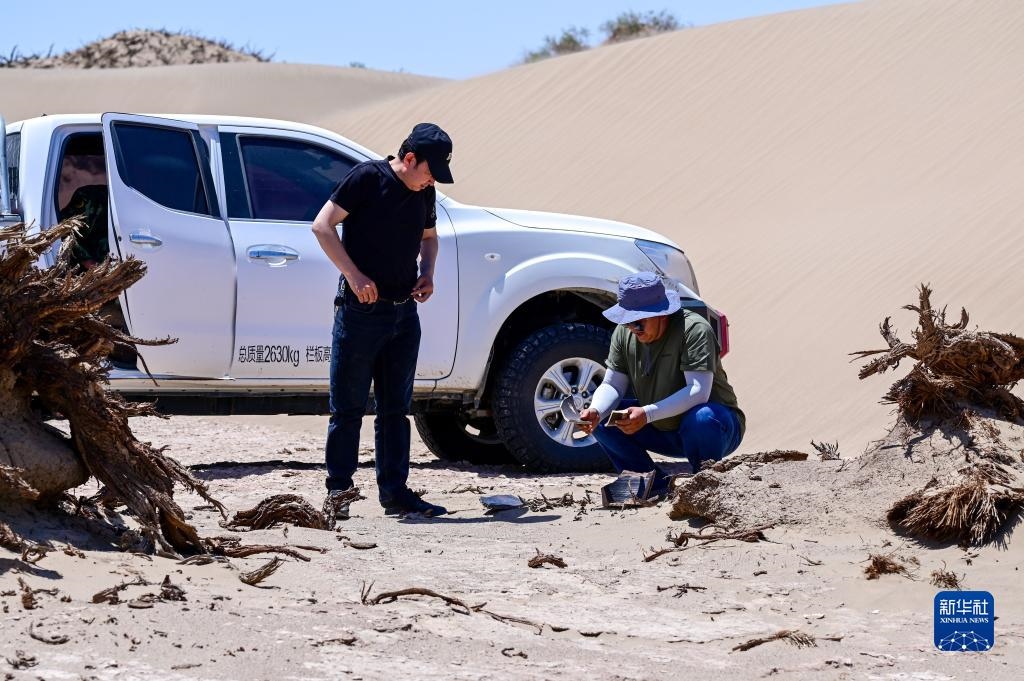 6月2日,額濟(jì)納旗文物保護(hù)中心工作人員在查看一處墓葬封土堆。