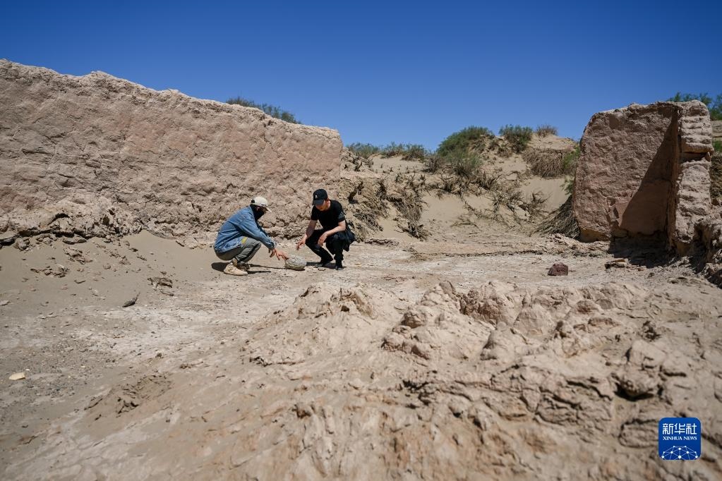 6月2日,額濟(jì)納旗文物保護(hù)中心工作人員在居延遺址附近查看散落的陶片。