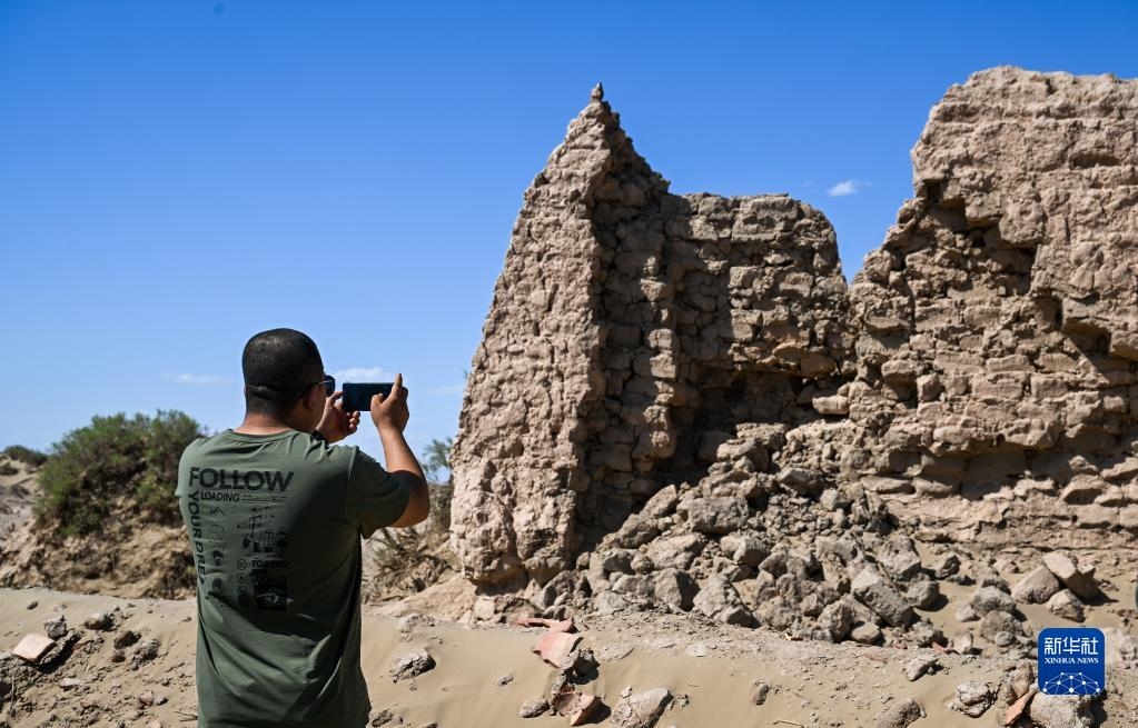 6月2日,額濟(jì)納旗文物保護(hù)中心工作人員拍攝紅廟遺址坍塌情況。
