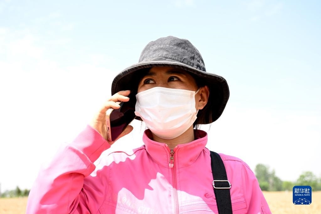 6月2日,在安徽省阜陽市阜南縣許堂鄉(xiāng)劉崗村,陳麗娟和朋友電話聯系下一站的收割業(yè)務。