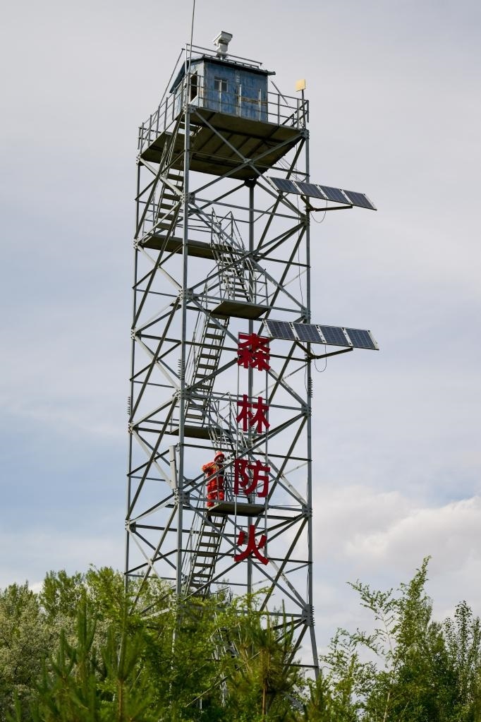 6月5日,臨河區(qū)國(guó)營(yíng)新華林場(chǎng)護(hù)林員登上瞭望塔準(zhǔn)備開展巡護(hù)工作。新華社記者 李志鵬 攝