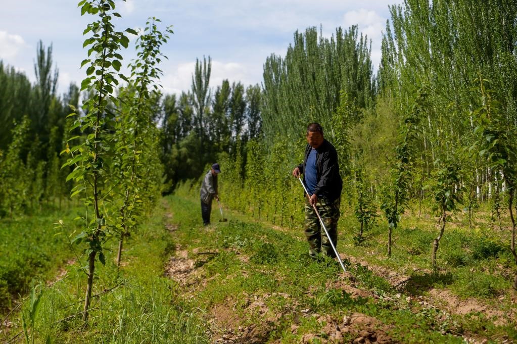 6月5日,臨河區(qū)國(guó)營(yíng)新華林場(chǎng)工人在管護(hù)林木。新華社記者 李志鵬 攝