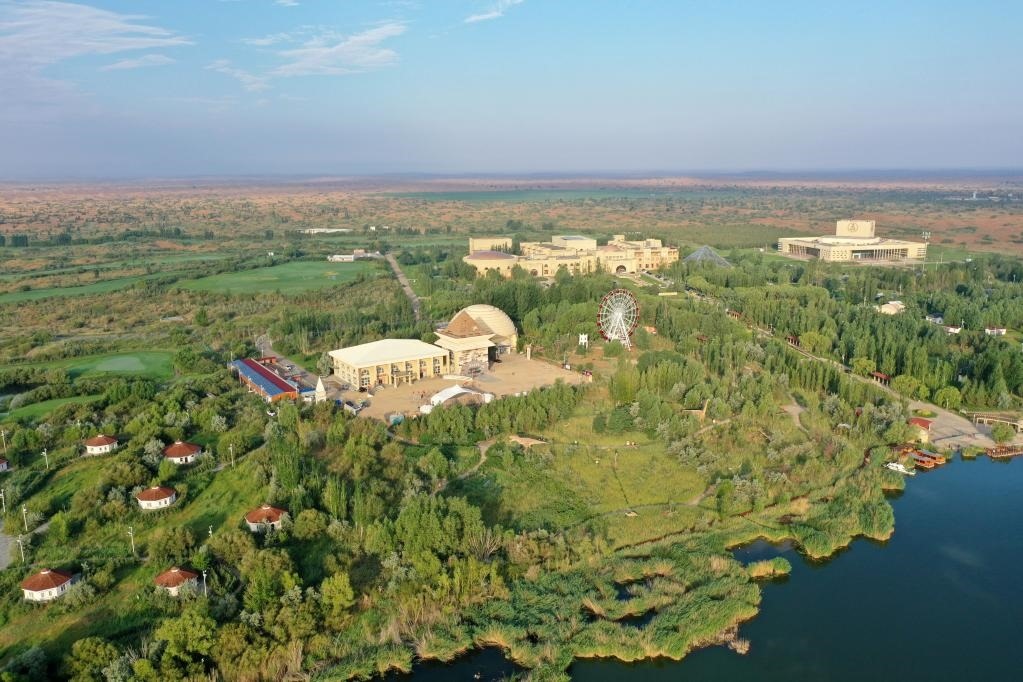 這是內(nèi)蒙古鄂爾多斯市庫(kù)布其沙漠腹地的七星湖景區(qū)(2021年7月17日攝,無人機(jī)照片)。新華社記者 金良快 攝