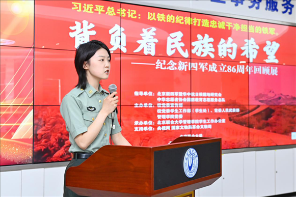 為深入學(xué)習(xí)貫徹習(xí)近平新時(shí)代中國特色社會(huì)主義思想主題教育,落實(shí)習(xí)近平加強(qiáng)全民國防教育的重要指示精神,弘揚(yáng)愛國主義精神、增強(qiáng)全民國防意識(shí),推動(dòng)全民國防教育進(jìn)校園,深化學(xué)?!按笏颊n”建設(shè),6月9日,由北京新四軍暨華中抗日根據(jù)地研究會(huì)、中華志愿者協(xié)會(huì)國防教育志愿服務(wù)總隊(duì)指導(dǎo),北京聯(lián)合大學(xué)黨委學(xué)生工作部(學(xué)生處)、黨委人民武裝部、黨委宣傳部、北京聯(lián)合大學(xué)新時(shí)代文明實(shí)踐中心建設(shè)規(guī)劃研究所、管理學(xué)院黨委共同主辦,管理學(xué)院學(xué)生工作辦公室承辦的“背負(fù)民族希望——紀(jì)念新四軍成立86周年回顧展”大會(huì)在北四環(huán)校區(qū)學(xué)生事務(wù)大廳舉行。