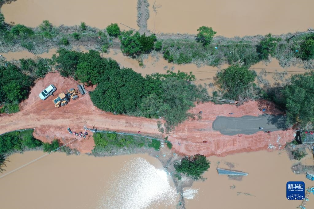 6月11日,在廣西合浦縣白沙鎮(zhèn),工人在施工修復(fù)遭洪水損毀的堤壩(無人機(jī)照片)。