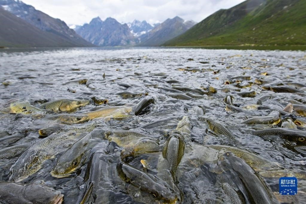 6月11日,在青海省果洛藏族自治州久治縣境內(nèi)的年保玉則,裸鯉在水中活動。   新華社記者 張龍 攝