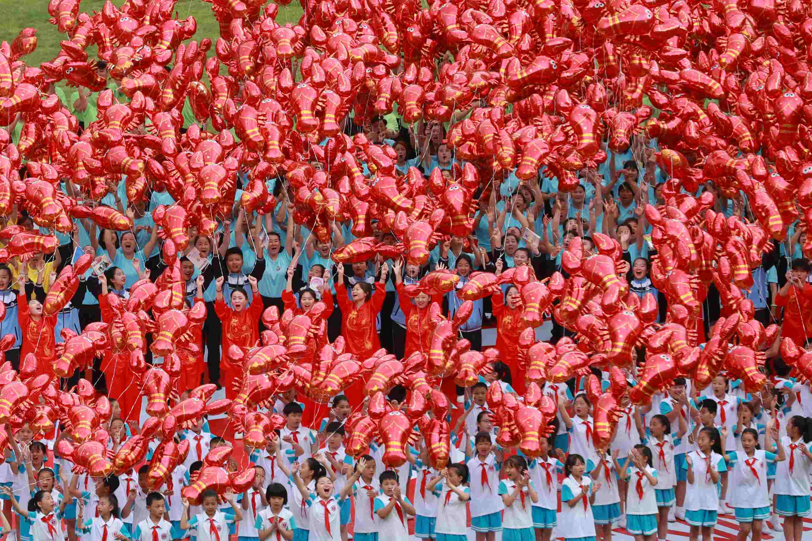 2023年6月12日,江蘇淮安,第二十三屆中國(guó)·盱眙國(guó)際龍蝦節(jié)開(kāi)幕式在盱眙舉行。參加演出的演員放飛“龍蝦”氣球。 視覺(jué)中國(guó)