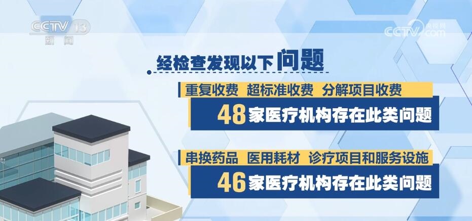 國家飛檢組共抽查了48家定點醫(yī)療機構(gòu),包括三級公立醫(yī)院40家、三級民營醫(yī)院3家、二級以下民營醫(yī)療機構(gòu)5家,經(jīng)檢查發(fā)現(xiàn)以下問題:一、重復(fù)收費、超標(biāo)準(zhǔn)收費、分解項目收費,48家醫(yī)療機構(gòu)存在此類問題。二、串換藥品、醫(yī)用耗材、診療項目和服務(wù)設(shè)施,46家醫(yī)療機構(gòu)存在此類問題。三、將不屬于醫(yī)保基金支付范圍的醫(yī)藥費用納入醫(yī)?;鸾Y(jié)算,43家醫(yī)療機構(gòu)存在此類問題。四、違反診療規(guī)范過度診療、過度檢查、超量開藥,39家醫(yī)療機構(gòu)存在此類問題。此外,部分醫(yī)療機構(gòu)存在分解住院,藥品、醫(yī)用耗材進銷存不符,未嚴(yán)格執(zhí)行國家組織藥品耗材集中帶量采購政策,按病種付費模式下高靠病組、低標(biāo)準(zhǔn)入院等其他違法違規(guī)問題;一些醫(yī)療機構(gòu)存在虛構(gòu)醫(yī)藥服務(wù)項目問題。