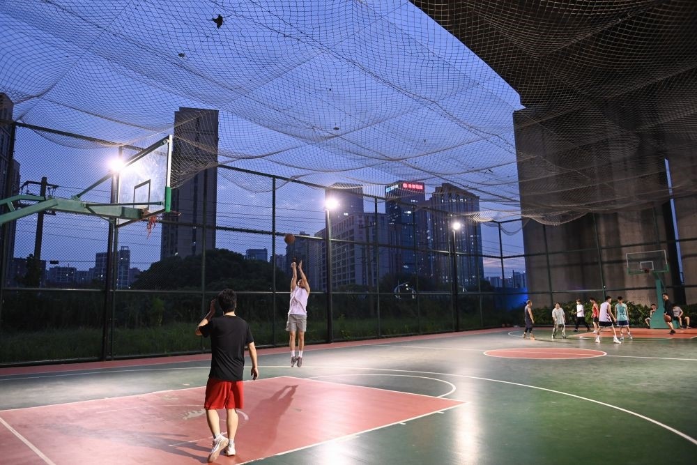 2022年9月20日,市民在位于高鐵橋下的錢江世紀(jì)城體育公園打籃球。在杭州,一批運(yùn)動(dòng)場(chǎng)館見(jiàn)縫插針地“嵌入”市民生活圈,城市空間的“邊角余料”正成為全民健身的“金角銀邊”。新華社記者 黃宗治 攝