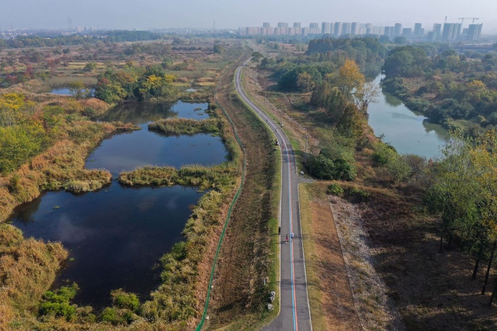 2022年11月12日,運(yùn)動(dòng)愛(ài)好者們?cè)谡憬『贾菔杏嗪紖^(qū)瓶窯鎮(zhèn)北湖草蕩生態(tài)濕地的健身游步道上參加健康跑比賽(無(wú)人機(jī)照片)。新華社記者 徐昱 攝