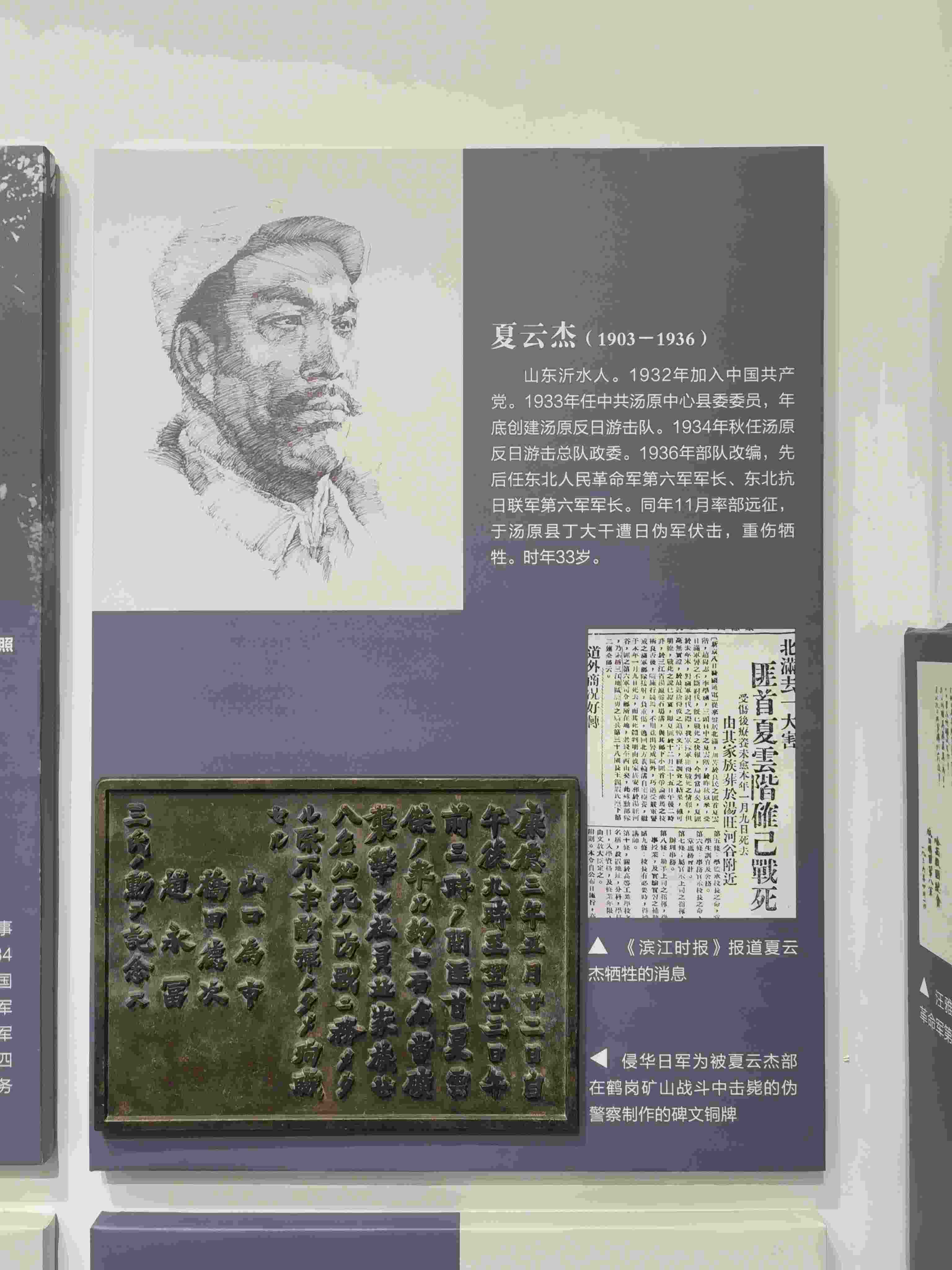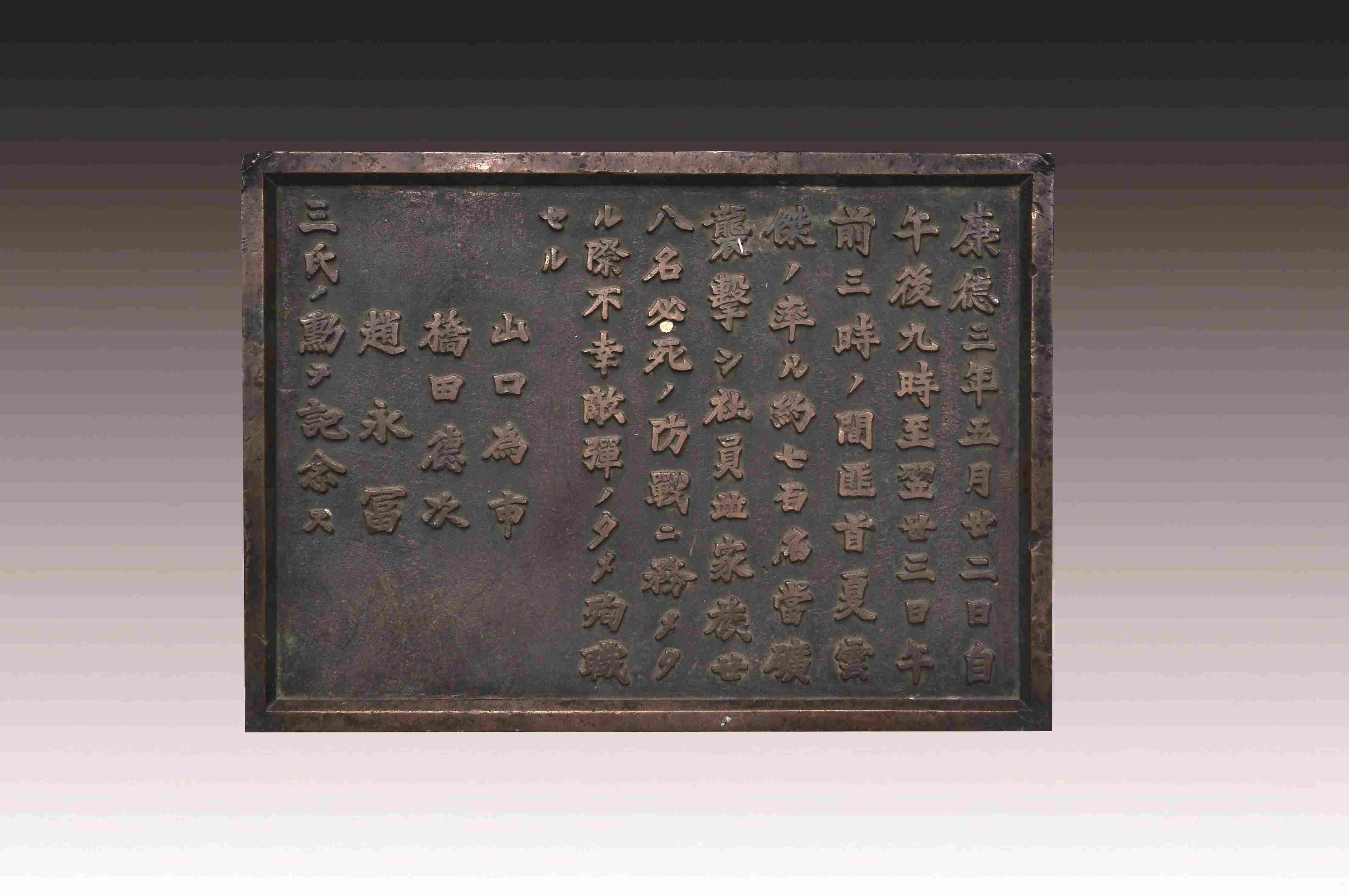 這塊碑文銅牌來(lái)自黑龍江鶴崗礦區(qū)的一座“忠靈塔”上,是日本侵略者為侵華戰(zhàn)爭(zhēng)中戰(zhàn)死的日偽軍而建。碑文銅牌,長(zhǎng)51厘米、高36.5厘米、寬2厘米、重12千克。上面的文字記載了日偽軍和抗聯(lián)戰(zhàn)士戰(zhàn)斗過(guò)程。從表述內(nèi)容來(lái)看,這塊碑文具有極大欺騙性。它制造了普通百姓遭土匪襲擊的“無(wú)辜”假象,妄圖以此加深東北民眾與革命隊(duì)伍之間的對(duì)立情緒。而事實(shí)真相是,1936年5月22日夜,東北人民革命軍第六軍軍長(zhǎng)夏云杰指揮六軍第一、二、三團(tuán),分兵兩路襲擊了鶴崗礦山。在我黨地下工作人員的密切配合下,順利解除了礦山警察二隊(duì)的全部武裝,并擊斃日軍指導(dǎo)官山口為市、橋田德次和偽礦山警察大隊(duì)隊(duì)長(zhǎng)趙永富。這次戰(zhàn)斗繳獲敵人大批槍支彈藥,我軍無(wú)一人傷亡。23日凌晨,夏云杰率領(lǐng)部隊(duì)攜帶戰(zhàn)利品凱旋。