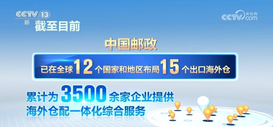 截至目前,中國郵政已在全球12個(gè)國家和地區(qū)布局了15個(gè)出口海外倉,累計(jì)為3500余家企業(yè)提供海外倉配一體化綜合服務(wù)。