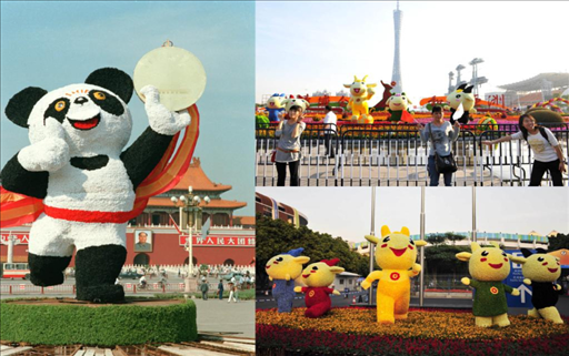 左圖:第11屆亞運會吉祥物熊貓“盼盼”的造型;右上圖:人們在第16屆亞運會吉祥物“祥和如意樂洋洋”雕塑前拍照;右下圖:廣州亞運會吉祥物造型花卉。資料照片