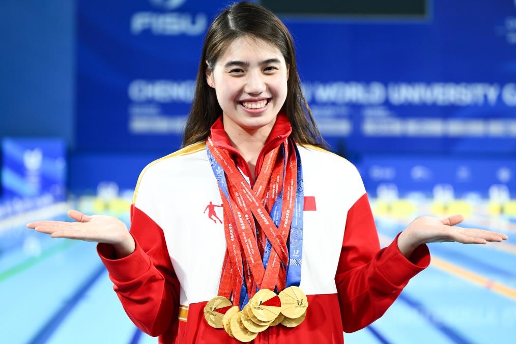 8月7日,參加成都大運(yùn)會(huì)的張雨霏展示她獲得的九枚金牌。新華社記者 吳剛 攝