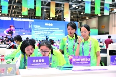 9月22日,亞運(yùn)會主新聞中心的志愿者們在工作。本報(bào)記者 楊震攝/光明圖片