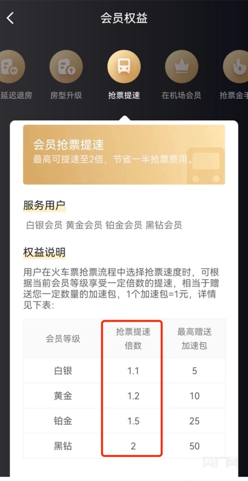 記者發(fā)現(xiàn),在另一個第三方購票平臺,會員分為普通、白銀、黃金、鉑金、黑鉆等不同等級,不同等級享受不同權益。從搶票提速這一權益來看,普通會員并未享受搶票提速這一權益,而白銀到黑鉆會員的搶票速度則依次提高1.1倍、1.2倍、1.5倍、2倍。