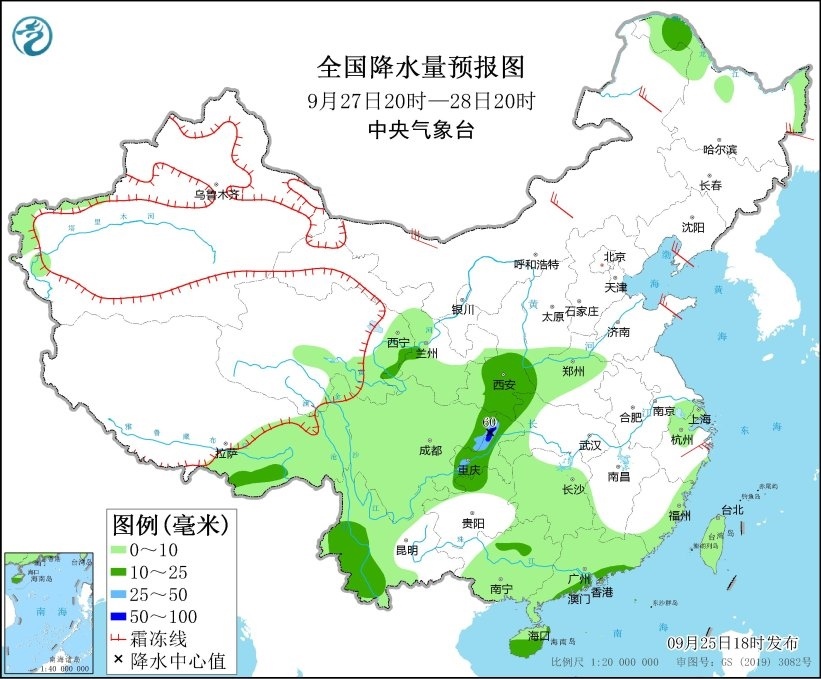 9月25日20時至26日20時,廣東西南部、廣西南部、海南島以及新疆北疆北部、西藏東南部、陜西南部等地部分地區(qū)有中到大雨,其中,海南島東部和南部等地部分地區(qū)有暴雨或大暴雨(100~180毫米)。另外,新疆阿勒泰山區(qū)有雨夾雪或雪。內(nèi)蒙古中西部、山東半島等地部分地區(qū)有4~6級風(fēng)(見圖1)。