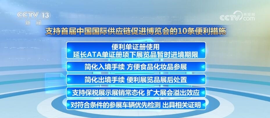 這10條措施的內(nèi)容是:設立常態(tài)化機構,隨時響應需求;派員入駐現(xiàn)場,提供服務保障;辦展方統(tǒng)一提供擔保,減輕境外參展企業(yè)負擔;縮短審批時限,提升參展便利化水平;設置專門通道,優(yōu)先辦理手續(xù);便利單證冊使用,延長ATA單證冊項下展覽品暫時進境期限;簡化入境手續(xù),方便食品化妝品參展;簡化出境手續(xù),便利展覽品展后處置;支持保稅展示展銷常態(tài)化,擴大展會溢出效應;對符合條件的參展車輛優(yōu)先檢測、出具相關證明。