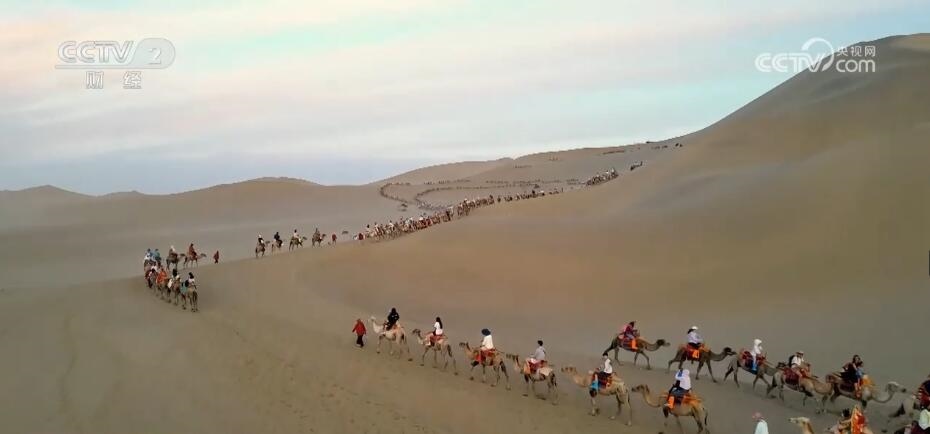 總臺(tái)記者 張磊:我現(xiàn)在所在的位置是敦煌的鳴沙山月牙泉景區(qū)。隨著暑期到來,當(dāng)?shù)氐穆糜稳藬?shù)也在不斷攀升。大家可以在我身后看到,游客現(xiàn)在正在騎著駱駝沿著鳴沙山腳下不斷蜿蜒穿行,場面顯得十分壯觀。以前,只有在小長假期間才會(huì)出現(xiàn)的“堵駱駝”的現(xiàn)象,這兩天已經(jīng)成為常態(tài)。