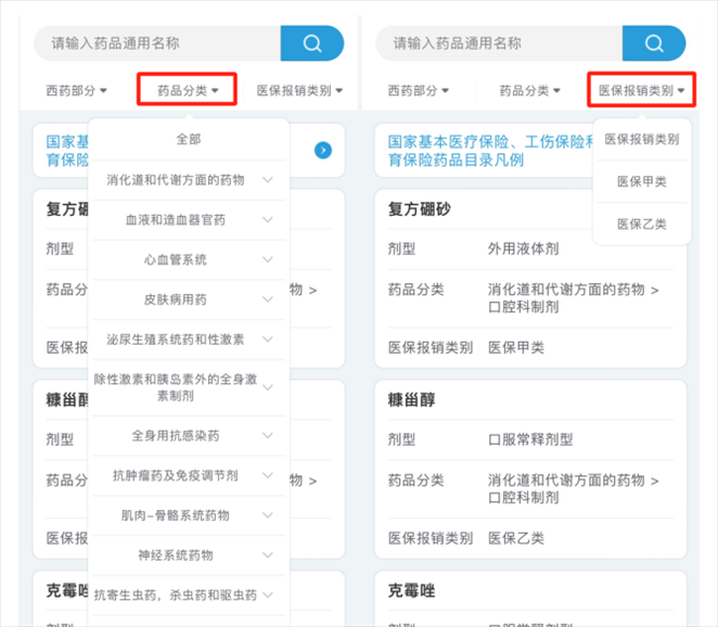 也可以根據(jù)自己的需求,選擇“藥品分類(lèi)”或“醫(yī)保報(bào)銷(xiāo)類(lèi)別”進(jìn)行篩選。